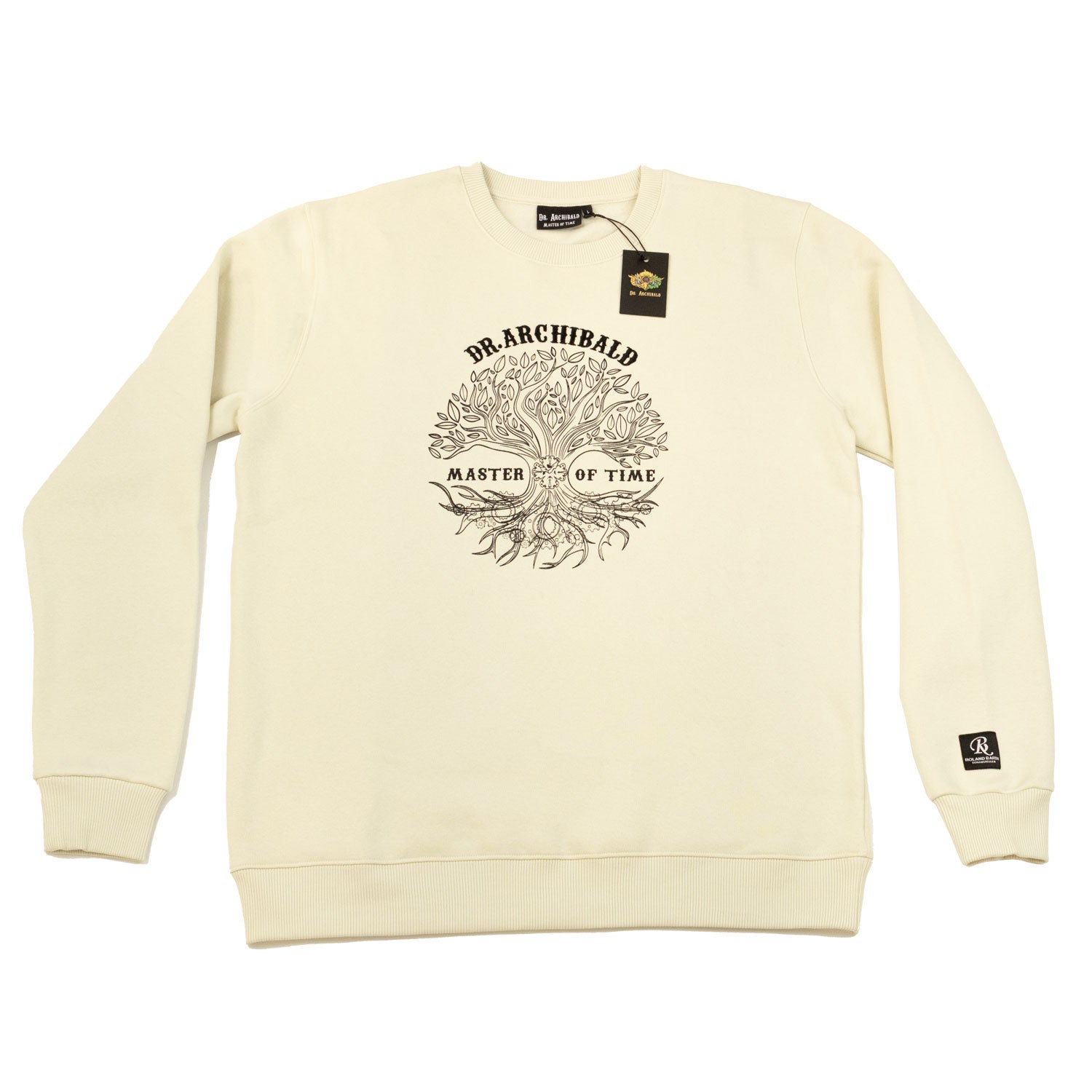 Schlicht von vorne, Statement von hinten: Der perlweiße Pullover mit feiner Stickerei vorne und großem Design-Print auf dem Rücken bringt die perfekte Kombi aus Understatement und Eyecatcher. Offizielles Merch von Dr. Archibald – Master of Time.